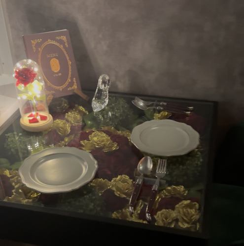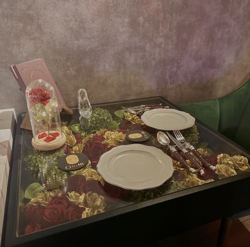 可愛い窓席。薔薇を敷き詰めたガラスのテーブルに美女と野獣を表現した小物がある窓席です。すぐに予約で埋まってしまうのでお早めにご予約ください♪